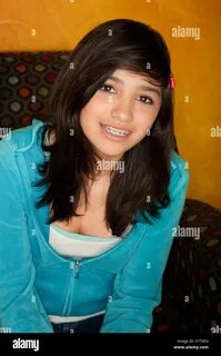 Pretty Latina Girl Seated on Colorful Chair Stock Photo - Alamy